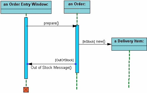 represents when the object is destroyed. This diagrams also shows conditions for messages to be sent to other object. The condition is listed between brackets next to the message. For example, a [condition] has to be met before the object of class 2 can send a message() to the object of class 3. The next diagram shows the beginning of a sequence diagram for placing an order. The object an Order Entry Window is created and sends a message to an Order object to prepare the order. Notice the the names of the objects are followed by a colon. The names of the classes the objects belong to do not have to be listed. However the colon is required to denote that it is the name of an object following the objectName:className naming system.